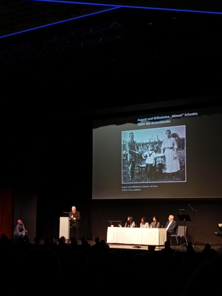 Im Laufe der Gedenkfeier traten weitere Personen auf die Bühne, um an die Schicksale ihrer Vorfahren zu erinnern. So wurde unter anderem an das Schicksal von August und Wilhelmine „Mimmi“ Schuster erinnert, die im Widerstand gegen das NS-Regime ihr Leben ließen.