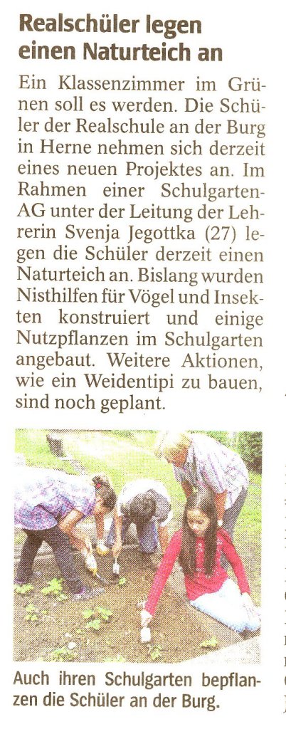 Für den Kampagnenzeitraum 2022-2024 bewirbt sich die Realschule an der Burg mit folgendem Projekt: Schaffung von Lebensräumen für Insekten. Die Umsetzung erfolgt, indem Nisthilfen für Insekten hergestellt und im Schulgarten angebracht wurden. Staudenbeete wurden angelegt und Obstbäume wurden gepflanzt. Beim Tag der offenen Tür verkauften die Schüler und Schülerinnen der Schulgarten AG Seedbombs.